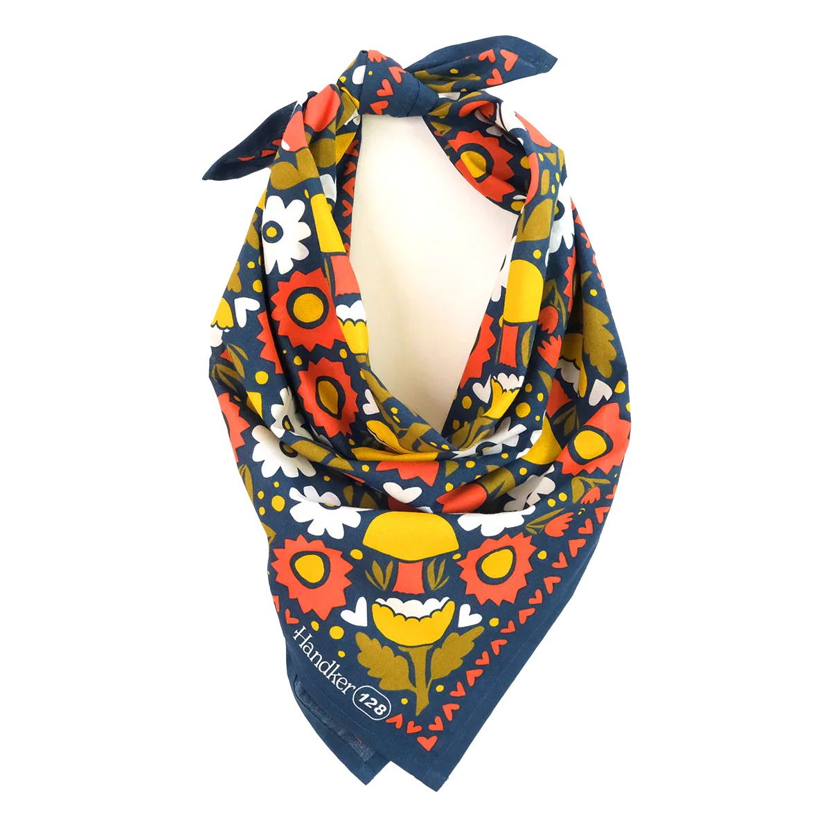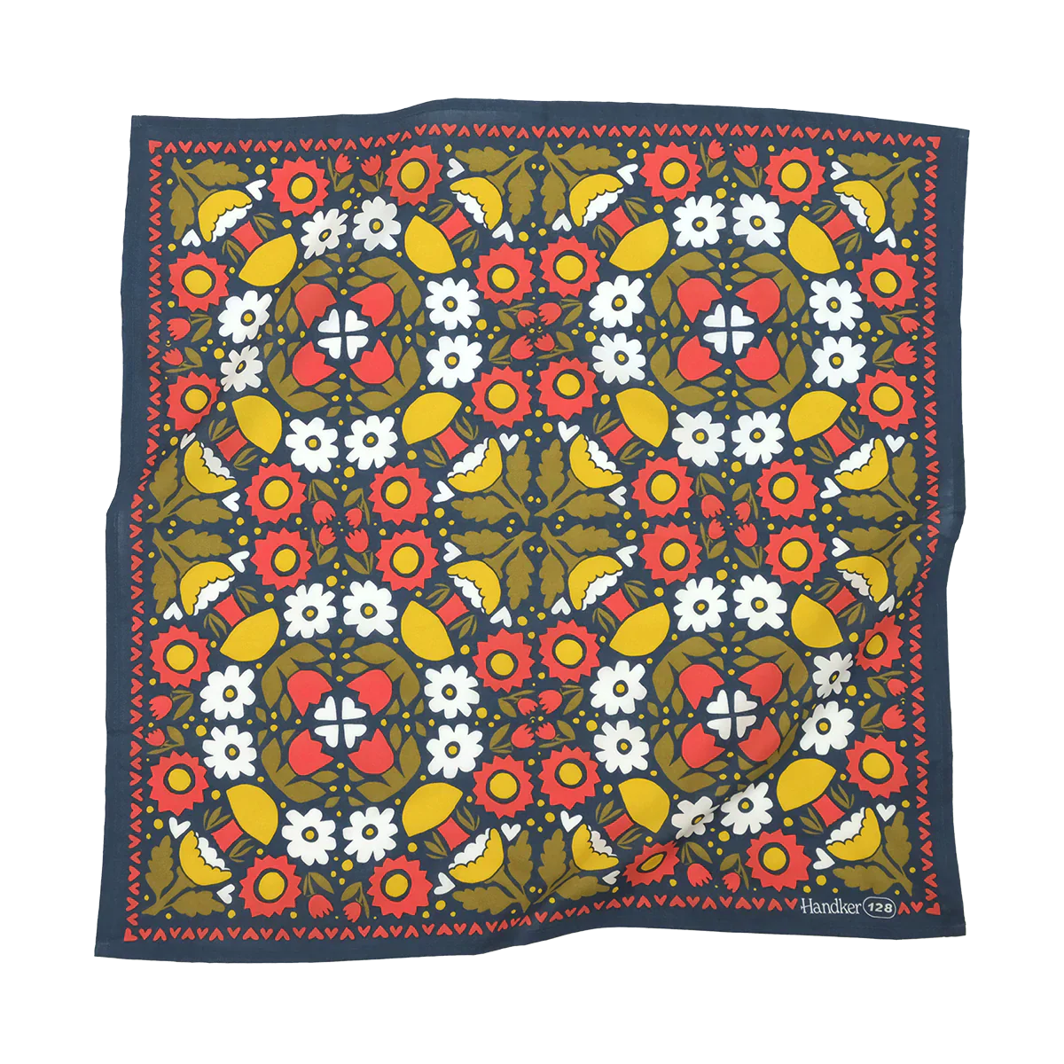 Color: Dark blue background with mustard yellow, hot red, and olive green flowers