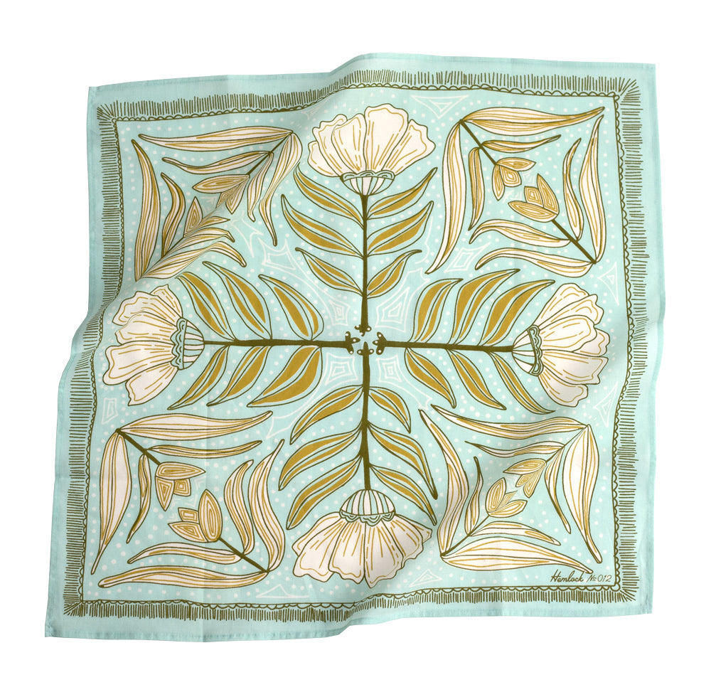 Hemlock Goods now HANDKER Eliza no 12 Premium Cotton Handmade Bandana flowers yellow sage, aqua