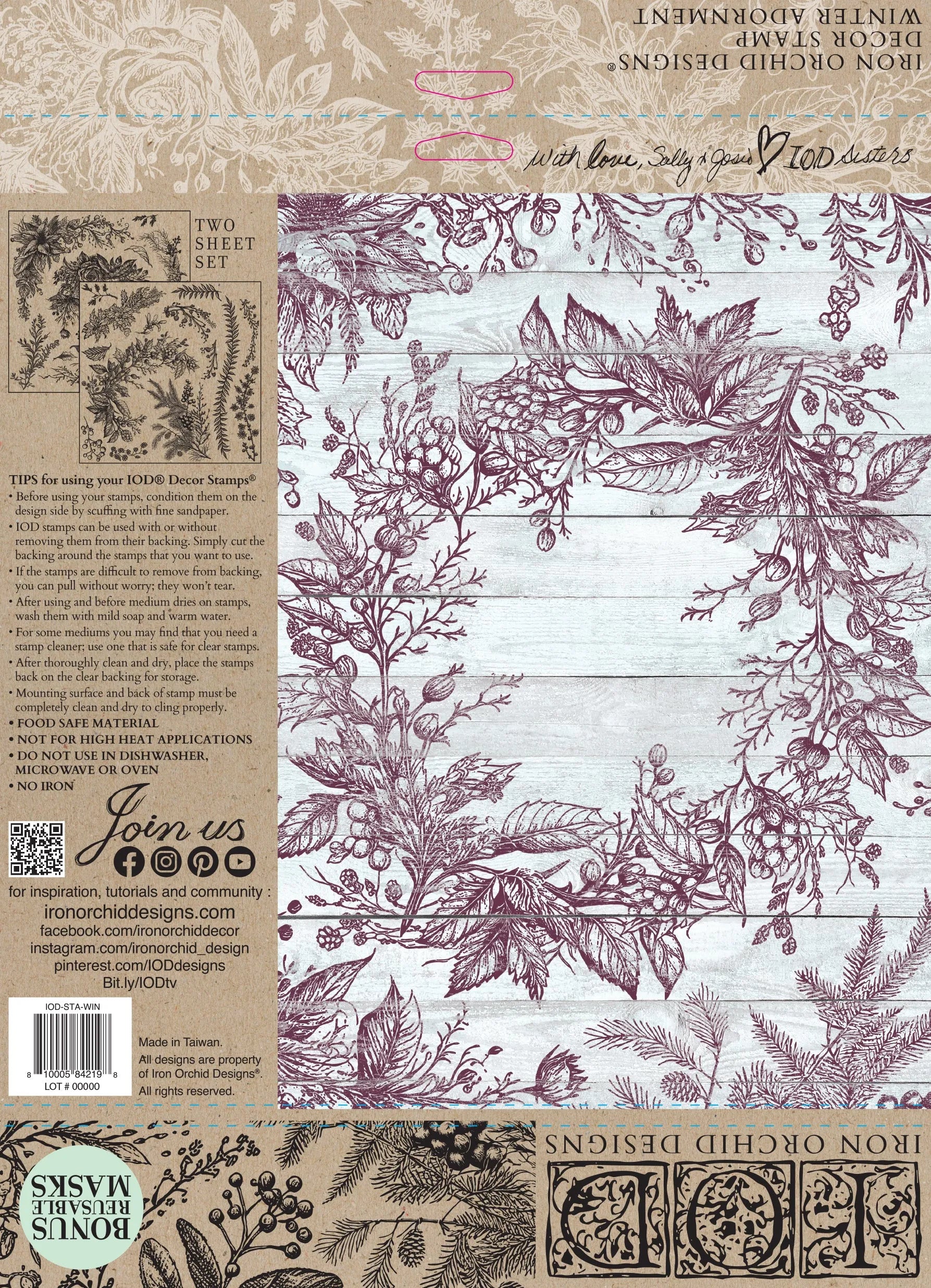 Iron Orchid Designs Winter Adornment stamp set is perfect for creating unique holiday decorations. The set includes two pages of line drawn evergreen boughs, holly, branches, and rose images. Use with Iron Orchid Design ink, watered down paint, food coloring, or embossing powder for professional-looking results. Limited edition. Each sheet is approx. 12x12 inches with several different stamps that can be used individually or as one.